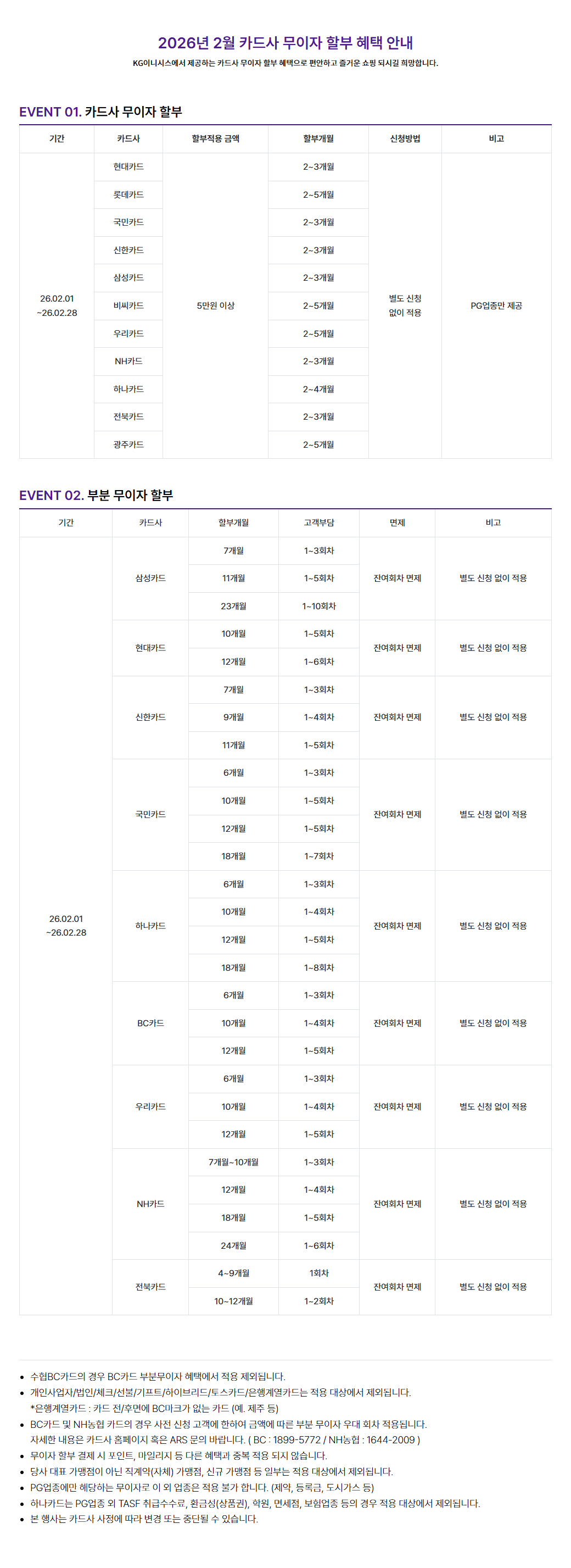 [2026년 02월] 이니시스 카드사별 무이자 및 부분무이자 안내