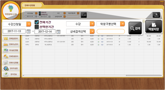 수강 상태별, 입금 상태별, 학생 구분별로 분류하여 관리가 가능하고,